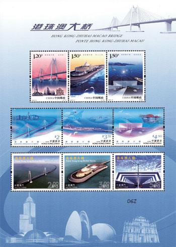 中國郵政定于10月30日發行《港珠澳大橋》紀念郵票一套3枚,郵票圖案名稱分別為:青州橋、東人工島和海底隧道。同時,中國郵政與香港郵政、澳門郵電共同印制同題材郵票小全張1枚,內含中國郵政、香港郵政、澳門郵電郵票各3枚。