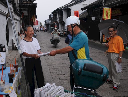 王曉豐在沙溪古鎮(zhèn)投遞報刊。