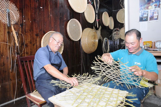 進入“非遺”文化館,王曉豐的話明顯多了起來:“父親的店以前在鎮(zhèn)東頭,搬到這兒也是近兩年的事兒。你們看這些大大小小的竹編制品,有果品盤、飯罩、魚簍等。我祖上就是做竹編的,父親從小就耳濡目染學習竹編。竹編從選竹、鋸竹、破竹到編織、刷磨,再到竹編成品,一套流程下來10多個步驟都是他親自完成,一個成品少則需要三五天,多則要幾個星期甚至一個月。”王曉豐搬了張小凳坐在父親身旁,“我平時工作忙,難得有空過來。”