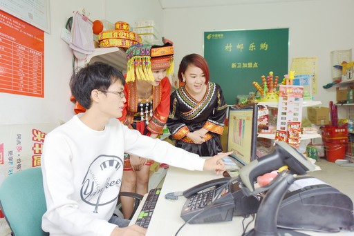 廣西壯族自治區灌陽縣郵樂購新衛加盟店店主陳清雅幫“瑤妹”在郵樂網上挑選商品。