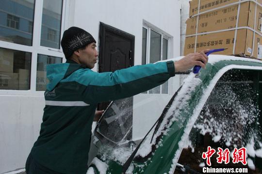 葉爾肯清掃郵遞車上的積雪。 郝勝忠 攝