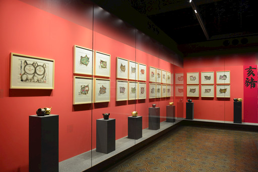 第一部分“生生不息”,意為“生肖輪回,生生不息”,不僅是指人類生命的生長與繁殖,也喻指韓美林藝術(shù)創(chuàng)作的變化與創(chuàng)生。這部分的展品,以韓美林創(chuàng)作的十二生肖動物作品為主,依照子、丑、寅、卯等十二生肖的排序,形成既連續(xù)又獨(dú)立的12個(gè)展示板塊。每一個(gè)板塊以一個(gè)生肖為主題,通過將韓美林相關(guān)的平面作品、立體作品以及陶瓷、紫砂、木雕、鐵藝等不同媒介的作品進(jìn)行展陳布置,既多樣豐富又統(tǒng)一整體。