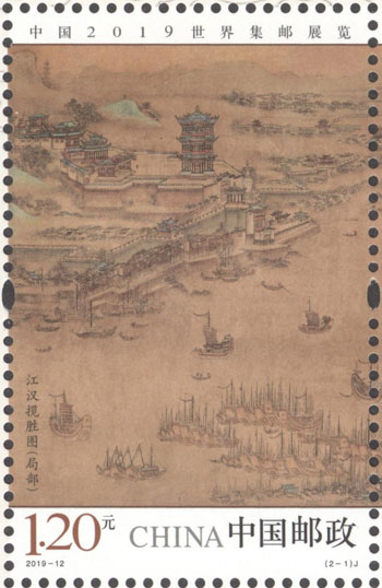 《江漢攬勝圖》是明代絹本國畫,國家一級(jí)文物,現(xiàn)藏于武漢博物館。畫面中心內(nèi)容為長江、漢水交匯及水上船只通行景象,漢陽晴川閣與武昌黃鶴樓隔江相望。這幅畫集中表現(xiàn)了武漢最為重要的地理、人文風(fēng)貌,體現(xiàn)武漢悠久歷史文化的同時(shí),也飽含了世界郵展匯聚八方來客的喻義。