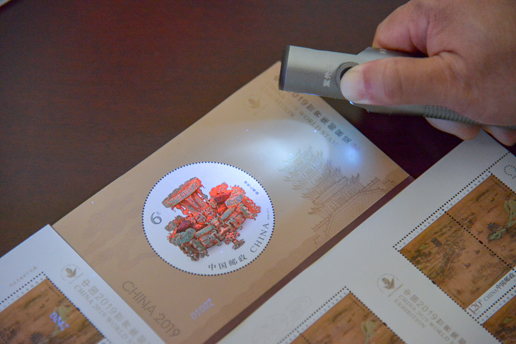 為了將世界郵展元素打印到小型張上,河南省郵電印刷廠設(shè)計(jì)針孔裝飾方式將“CHINA2019”元素打印到小型張上。目前世界上使用的最小郵票針孔為0.7毫米,河南省郵電印刷廠攻克技術(shù)難題,制作出0.6毫米針孔,成功應(yīng)用于此次世界郵展郵品上。