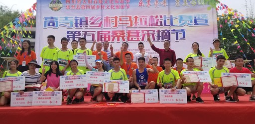 四川省樂至縣高寺鎮桑葚采摘節活動中“鄉村馬拉松比賽”獲獎者合影。趙彥成 攝