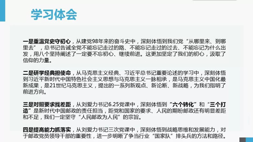 其他黨組成員分章節(jié)領(lǐng)學(xué)《選編》《綱要》和習(xí)近平總書記有關(guān)重要講話精神等重要內(nèi)容,并結(jié)合實(shí)際談體會(huì)。大家認(rèn)為,要不忘來(lái)時(shí)路,踐行新使命。以本次主題教育為契機(jī),扎實(shí)推進(jìn)郵政系統(tǒng)黨的政治建設(shè),深化形式主義、官僚主義集中整治,加強(qiáng)基層黨組織建設(shè),開展黨員領(lǐng)導(dǎo)干部綜合評(píng)估,持續(xù)深化巡視整改,聚焦改革發(fā)展的突出問(wèn)題進(jìn)行整改,把主題教育成效轉(zhuǎn)化為攻堅(jiān)克難、干事創(chuàng)業(yè)的實(shí)際成果。
