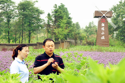王靜華(右)向郵儲銀行信貸員介紹“紅旅小鎮”。