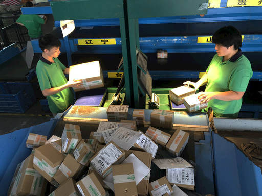 余杭集包處理中心的員工在用混合收寄一體機處理包裹?! 跬踅?nbsp; 攝