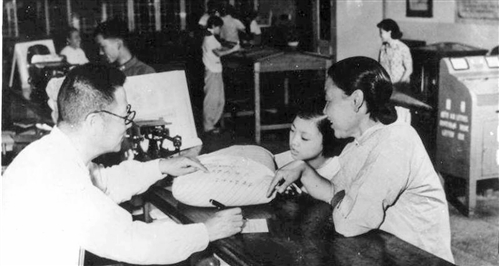 1958年,東四郵局沖破思想的藩籬,在全行業率先做到“從臺后到臺前”,為用戶提供服務。圖為東四郵局老“郵務佐”于洪澤(左一),主動轉變思想,帶領大家走出柜臺為用戶填寫單據。 (資料圖片)