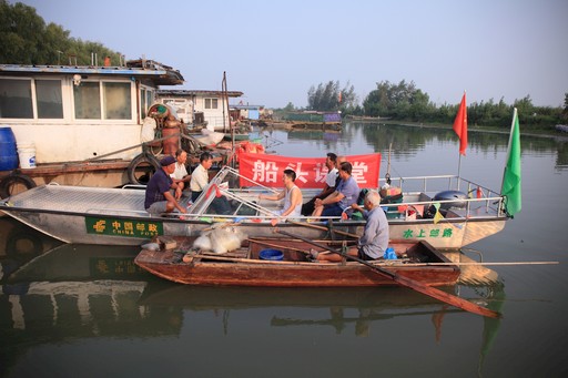 江蘇省淮安市洪澤區(qū)老子山鎮(zhèn)三面環(huán)水,300平方公里面積90%為灘涂水面。全鎮(zhèn)1.8萬居民中,六成左右是散居湖蕩灘頭、從事?lián)撇痘蝠B(yǎng)殖的漁民。簍,用繩子拴在腰上;娃,用繩子拴在船上;船,用繩子拴在岸上……漁民們常年過著“船底無刮子”的漂泊生活,內(nèi)心都渴望一處溫暖的港灣,危難時可以依靠,需要時獲得幫助。他們因此習(xí)慣在船上掛一面國旗,作為湖上生活的精神寄托以及四季平安的護(hù)身符。“他是黨派來的人。”在漁民們心中,唐真亞也是湖區(qū)的一面旗幟。