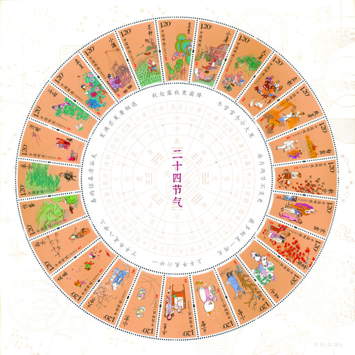 王虎鳴在小全張邊飾設(shè)計(jì)上使用了中國(guó)古代數(shù)學(xué)、天文學(xué)著作中的元素,包含日、月、星斗、算酬、古人描繪的天與地關(guān)系圖、紫微垣以及古星圖等。這些元素描繪了中國(guó)古人如何通過觀察自然來確定二十四節(jié)氣,從事農(nóng)業(yè)生產(chǎn)和生活。郵票中心的圓中將太極、地支、黃道度數(shù)與二十四節(jié)氣的對(duì)應(yīng)關(guān)系進(jìn)行了展現(xiàn),進(jìn)一步闡明了中國(guó)傳統(tǒng)文化的博大精深和相互聯(lián)系,也表達(dá)了中華民族一直以來注重人與自然的關(guān)系,講究天人合一的思想。