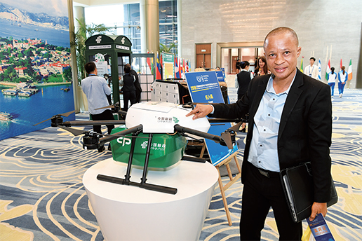 現(xiàn)場展示的郵政無人機(jī)和無人投遞車。