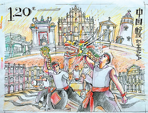 第2枚“中西薈萃  和諧共融”,議事廳前以分別手握龍頭與龍尾的舞醉龍師傅為前景,舞醉龍團隊姿態各異,相互呼應,展現澳門舞醉龍的特色。背景為人們熟悉的澳門標志性景觀大三巴牌坊、媽閣廟、東望洋燈塔,還有葡韻住宅式博物館。“通過中西建筑物的簡化圖形,反映澳門多元文化色彩和諧共融。在舞醉龍的紅、黃、黑、白等傳統色彩與葡式建筑的橘黃、玫紅與白色調糅合下,營造出歡快愉悅的氛圍。”韓秉華介紹。