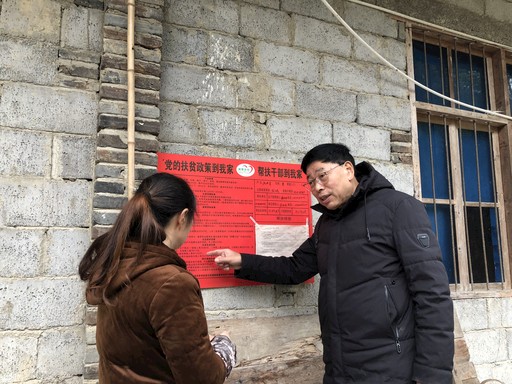 陳澤維向6組貧困戶龐召華的妻子詳細講解可享受的低保、教育資助、危房改造補貼、無障礙廁所改造、免交合作醫療費用等扶貧保障政策。在布袋溪村,每家貧困戶門前都張貼著“扶貧干部到我家”的公示牌。