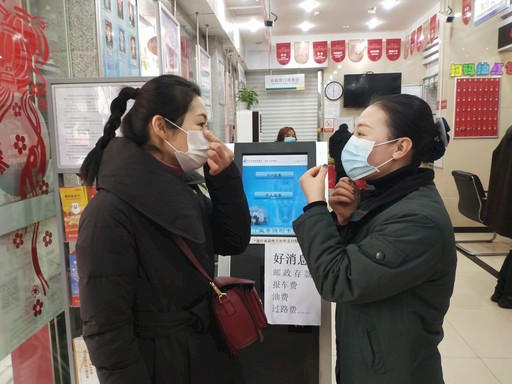 在四川省資陽市樂至縣公園路郵政營業大廳內,大堂經理或為客戶測量體溫,或耐心指導客戶怎樣正確佩戴口罩,或向客戶講解防疫安全知識,廳堂內秩序井然。