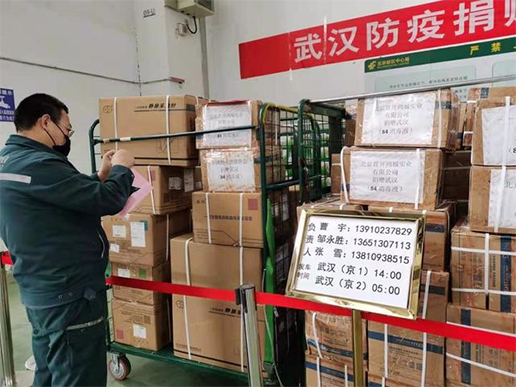1月25日,中國郵政開通了防疫捐贈物資免費運輸和配送的綠色通道。除了專機運輸外,從北京出發的陸運物資都是通過北京郵件綜合處理中心發往武漢。