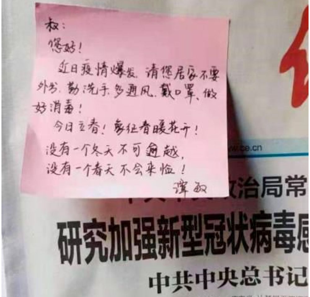 2月4日,正值立春節(jié)氣。在這個(gè)充滿希望的日子,譚敏寫下了一張張滿懷關(guān)切的“防疫小紙條”,叮囑用戶們做好自身防護(hù),注意身體健康,要相信“沒有一個(gè)冬天不可逾越,沒有一個(gè)春天不會(huì)來臨”。當(dāng)天下午,客戶李先生在取報(bào)紙時(shí),看到了貼在報(bào)紙上的小紙條。他立即給譚敏打電話說:“小譚,你的囑咐我收到了,我和你阿姨很好,謝謝!你每天外出工作,一定要注意安全!”話音未落,譚敏已淚目。