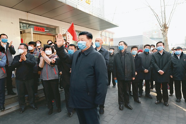 2020年2月10日,中共中央總書記、國家主席、中央軍委主席習(xí)近平在北京調(diào)研指導(dǎo)新冠肺炎疫情防控工作。這是習(xí)近平來到朝陽區(qū)安貞街道安華里社區(qū),了解基層一線疫情聯(lián)防聯(lián)控情況。 新華社記者 鞠鵬/攝