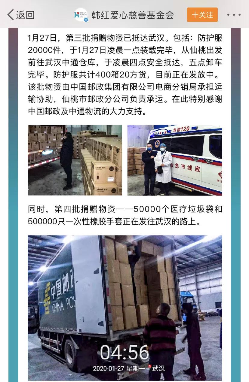 1月26日22時,湖北郵政收到由中國郵政集團有限公司轉發(fā),由北京韓紅愛心慈善基金會寄出的《關于請求幫助寄遞救援物資的函》。