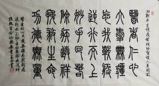 郵友們都知道,蕭老師不僅畫畫得好,字也寫得特別棒,楷、行、草、隸、篆及金文無所不能。2014年發(fā)行的《元曲》特種郵票,6枚郵票上面出現(xiàn)的代表性名句,均是蕭老師自己用6種書體寫就。這次蕭老師運用篆體寫下的抗疫書法作品,第一幅內(nèi)容為“眾志成城,抗擊疫情。山河無恙,百姓康寧”;第二幅為“萬眾一心,共克時艱,抗擊疫情,國泰民安”;第三幅為“醫(yī)者仁心,大愛無疆。忘我戰(zhàn)‘疫’,逆行而上。妙手回春,除疾送祥。挽救生命,功德無量”,上款為“向戰(zhàn)斗在抗疫前線的醫(yī)護人員致敬!”可謂字字見功力,幅幅寄深情。