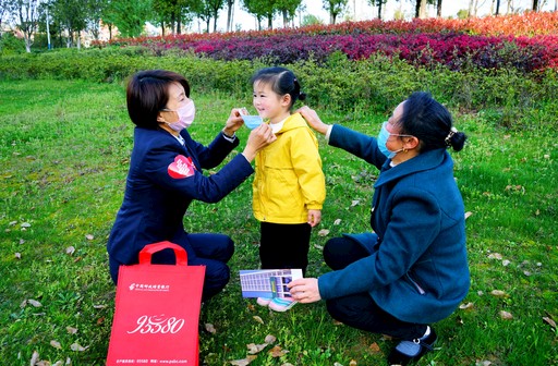 3月20日,郵儲銀行安徽省金寨縣支行在“郵愛公益日”設立三周年之際,開展宣傳活動。在疫情防控期間,該支行創新舉措,讓宣傳活動、疫情防控及文明創建相結合,將企業品牌宣傳與踐行社會責任深度融合。圖為該支行宣傳人員在公園執勤點向居民介紹“郵愛公益”時,為小朋友戴上防護口罩。 □李明 攝影報道