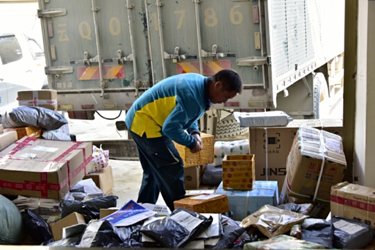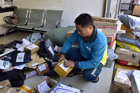 新年第一天,盡管屬法定節假日,但從州府六庫方向發來的郵車還是如約抵達郵政所。桑南才打開車廂門——又是滿滿一車包裹!桑南才記得,1987年自己剛到所里上班時,郵車隔天才一班,一個月也就200來份郵件。現在每天兩班郵車,一天的郵件量都快到200件了。