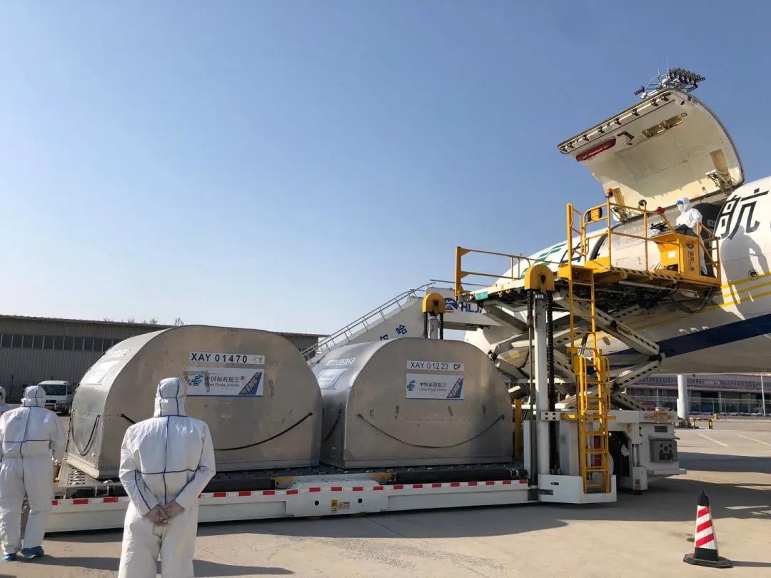 牡丹江機場地面保障人員接卸郵航包機運抵的醫用物資。