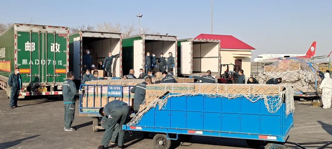 哈爾濱郵區中心局員工將郵航包機運抵的醫用物資進行裝車。