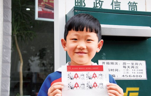 5月11日,河南省安陽市滑縣紅旗路郵政營業廳外,一位小郵迷成功購得心儀的《眾志成城 抗擊疫情》郵票,興奮地展示起來。牟會鋒  攝