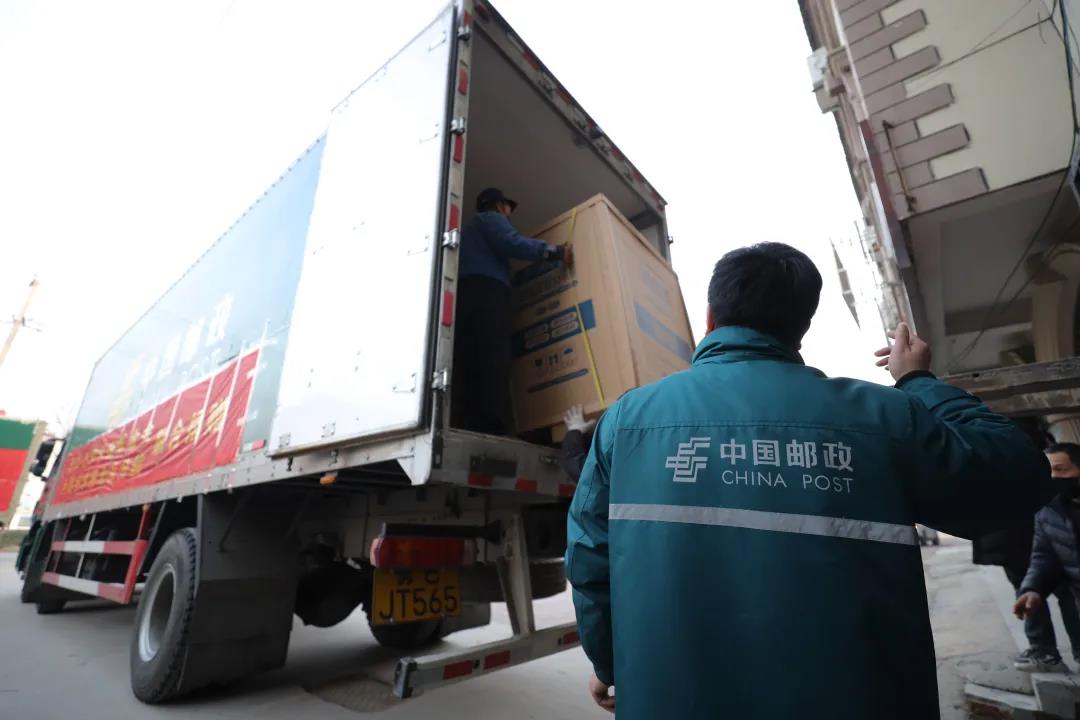 在救治工作最艱難的2月,火神山醫院和雷神山醫院日夜搶救病患。病房外,無數郵政員工日夜穿梭在醫院配送醫療物資,綠色的身影守護著生的希望。1750臺平板電腦、800個平板支架、700個自動洗手套裝、610部對講機、600個體溫計……2月4日,武漢郵政接到小米公司捐贈物資的信息,立刻緊急調用了各類車輛,大到8噸郵車、4.2米廂式車,小到面包車,甚至小拖車。從小米公司到火神山醫院單程需要50公里,郵車進不去,心急如焚的郵政員工們就用小拖車一趟趟拉、用肩膀一箱箱扛、用胳膊一袋袋抱,最長的一次步行是在泥濘中走了3公里……
