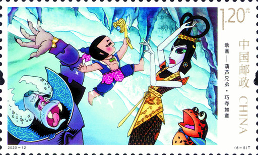 《葫蘆兄弟》故事情節復雜,場面變化大,人物也較多。人物就有七個葫蘆兄弟、老爺爺、蛇精、蝎子精和穿山甲等,而七個葫蘆兄弟性格特點和超能力也不一樣,都需要區別表現出來。從故事情節來說,不少是驚心動魄、險象環生的激烈較量場面。比如,第3枚郵票“絕路逢生”反映三娃大戰群妖,打得妖怪落花流水、抱頭鼠竄,畫面表現的是三娃用神力斬斷蝎子精的寶刀,蝎子精大驚失色的情形,此段畫面是故事的一個小高潮;再如第5枚郵票“巧奪如意”主要講述擁有隱身神力的六娃機智勇敢地盜取了蛇妖的寶貝“如意”,救出了幾位兄長,此段情節尤為精彩。
