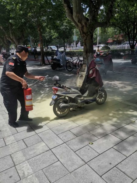當天中午12:20分,網點正在準備例行消毒,張師傅對網點及周邊環境進行日常巡查,第一時間發現了自燃的電動車,并迅速拿出了滅火器上前滅火。“外面的電動車很多,停放的又比較密集,不滅掉等下會燒到其他車子。”張蘭洲在保安的崗位上工作了十多年,“郵儲銀行襄陽市分行營業部經常進行消防安全培訓,而且每月進行演練,知道怎么滅火,這點事情沒什么怕的。”