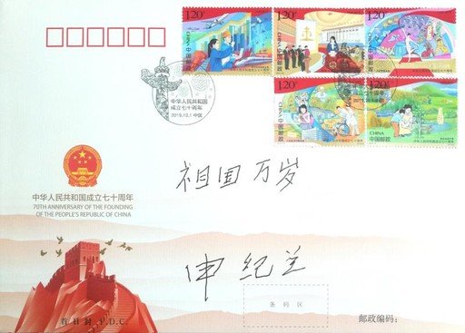 2019年10月,申紀蘭在《中華人民共和國成立七十周年》首日封上題字。