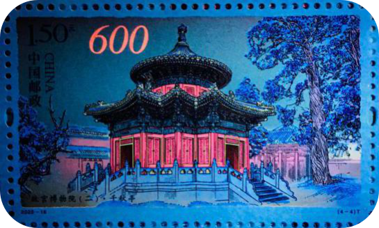 郵票采用黑、藍、紅、黃、金、無色紅熒光六色膠印。設計師和工藝團隊一道,經過多次特種金油墨配制和上機試制,反復比較色彩效果,才最終選定油墨。另外,在郵票的左上方藏有無色紅熒光油墨印制的“600”字樣,在紫光燈下才會顯現(xiàn)出來。