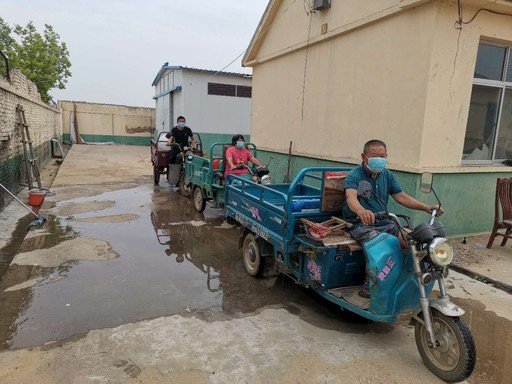 當(dāng)?shù)匕傩镇T著三輪車到支局打水。