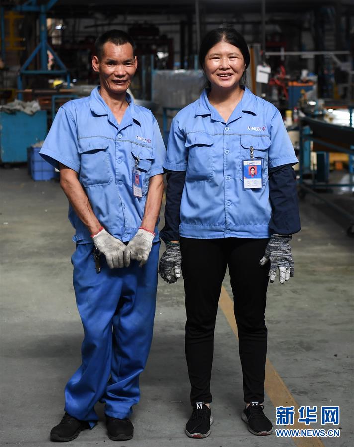 在佛山市三水區(qū)廣東星星制冷設(shè)備有限公司車間內(nèi),來自四川涼山彝族自治州鹽源縣的貧困務(wù)工人員李力挖(左)、何公各夫婦合影(6月22日攝)。 新華社記者 鄧華 攝