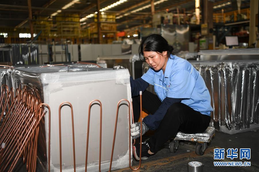 在佛山市三水區(qū)廣東星星制冷設(shè)備有限公司車間內(nèi),來自四川涼山彝族自治州鹽源縣的李力挖在流水線上組裝作業(yè)(6月22日攝)。 新華社記者 鄧華 攝