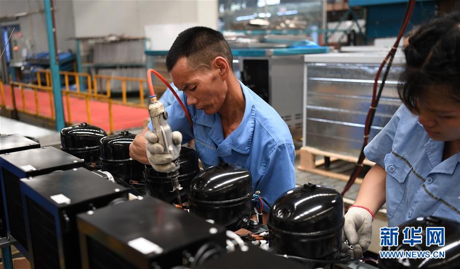 在佛山市三水區(qū)廣東星星制冷設(shè)備有限公司車間內(nèi),來自四川涼山彝族自治州鹽源縣的李力挖(左)在流水線上組裝作業(yè)(6月22日攝)。 新華社記者 鄧華 攝