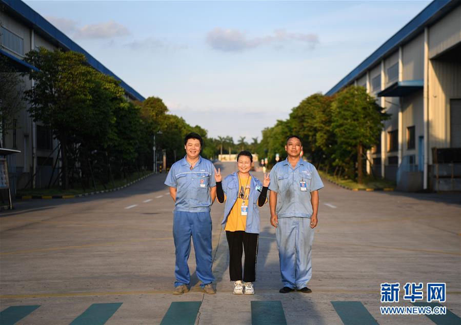 在佛山市三水區(qū)廣東星星制冷設(shè)備有限公司,來自四川涼山彝族自治州鹽源縣的貧困務(wù)工人員伍元國、易爭(zhēng)咪、董正軍(從左至右)下班后在廠區(qū)合影,他們通過東西部扶貧協(xié)作在這里實(shí)現(xiàn)就業(yè)(6月22日攝)。 新華社記者 鄧華 攝