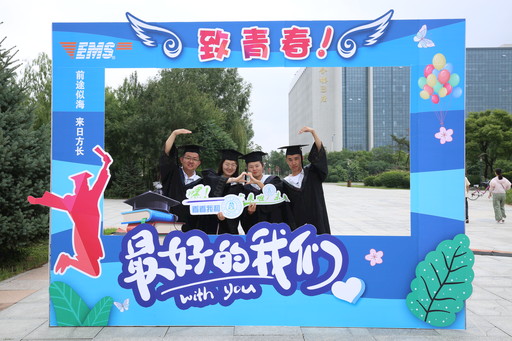 7月12日,內蒙古郵政分公司與內蒙古財經大學首次合作,在校園內為畢業生量身打造了畢業郵局,設計展出了獨具內蒙古特色的“青春不散場”藍色蒙古包相框、充滿青春活力的“致青春·最好的我們”抖音版式相框。穿著學士服的畢業生流連其間,紛紛攝影打卡留念,保存一份美好的青春回憶。圖為畢業生在“致青春·最好的我們”的相框中合影。 □記者 王圓圓 通訊員 陳婧 攝影報道