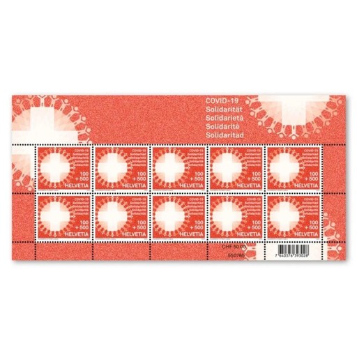 4月6日,瑞士郵政發行抗擊疫情附捐郵票,全套1枚。郵票面值1法郎,附捐5法郎,按照5法郎出售,表明瑞士郵政提供無償服務。這是第一套抗擊疫情附捐郵票。郵票圖案表達了瑞士民眾攜手抗疫的決心,捐款所得全數交瑞士團結基金會和瑞士紅十字會用于應對疫情,郵票以全張為單位在瑞士郵政官網出售。