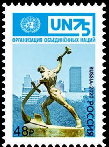 5月22日,俄羅斯郵政發行1枚郵票紀念聯合國成立75周年。郵票圖案為雕塑《鑄劍為犁》,這是蘇聯于1957年送給聯合國的禮物,并于1958年布魯塞爾國際博覽會上榮獲大獎,是著名雕塑大師烏切吉奇的名作之一,代表了世界各國人民千百年來渴望和平的美好愿望。6月4日,德國郵政發行1枚郵票,慶賀聯合國建立75周年。