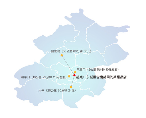 以北京市東城區倉南胡同的某甜品店為坐標,選擇即時配服務,剔除高峰時段的附加費用,我們來看一下統計數據。(見表6)