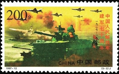 1997年8月1日,中國郵政發行了1997-12《中國人民解放軍建軍七十周年》紀念郵票1套5枚,票名分別是“陸軍”“海軍”“空軍”“戰略導彈部隊”和“陸??章摵涎萘暋?枚郵票,以陸、海、空和戰略導彈部隊的主戰兵器為主圖,背景是按兵種按時間有機串聯在一條主線上的建軍七十年來的重大事件,淡彩的背景與重彩的主圖珠聯璧合,能夠讓人自然重溫人民解放軍七十年的成長歷程,真切感受人民軍隊的現代化步伐。每幅畫面雖沒有出現一個軍人形象,但那隆隆開進的坦克、劈波斬浪的軍艦、呼嘯而過的戰機和騰空而起的導彈,創造了一種千軍萬馬奔騰向前的氣勢,表現出現代化戰爭操縱著現代武器與敵人決戰千里之外的新特點,收到了此處無人勝有人的藝術效果。