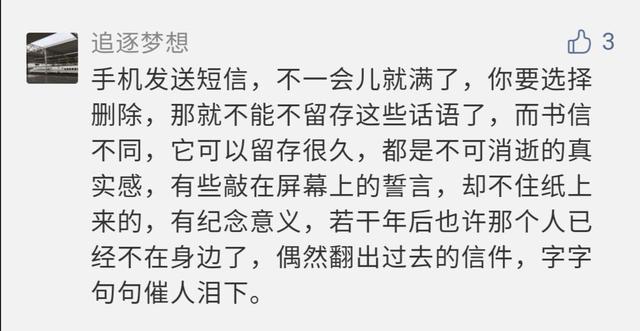 網(wǎng)友追逐夢(mèng)想說:“手機(jī)發(fā)送短信,不一會(huì)兒就滿了,你要選擇刪除,那就不能留存這些話語了。而書信不同,它可以留存很久,都是不可消逝的真實(shí)感。有些敲在屏幕上的誓言,卻不如紙上來的,有紀(jì)念意義。若干年后也許那個(gè)人已經(jīng)不在身邊了,偶然翻出過去的信件,字字句句催人淚下。”