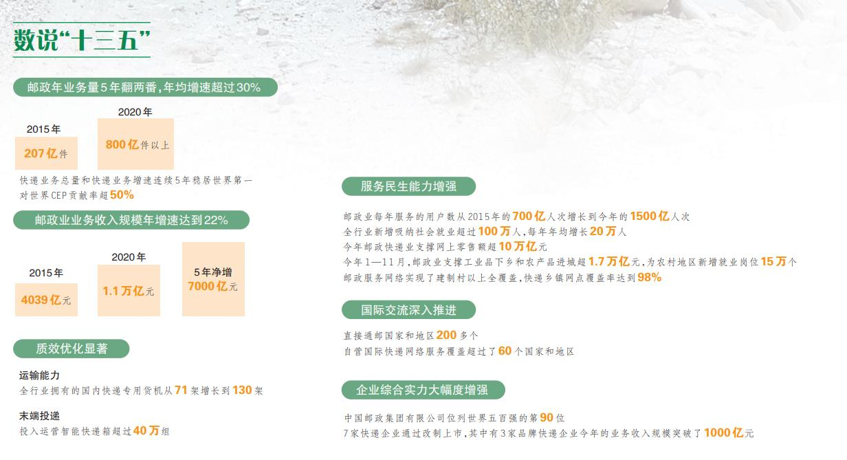 5年來,郵政業發展突飛猛進。快遞年業務量從2015年的207億件增長到今年的800億件以上,5年翻了兩番。我國包裹快遞量超過了美國、日本、歐洲等發達經濟體總和,對世界CEP(快遞包裹)市場貢獻率超過了50%。2019年,中國郵政行業業務收入累計完成9642.5億元,與此同時,城市末端智能快件箱的市場需求快速增長,農村郵政服務網絡及扶貧成果引人矚目……回望“十三五”,郵政業拔節孕穗、碩果累累。坐上駛向人民美好生活的郵車,一幅幅美妙的圖景不斷閃現。