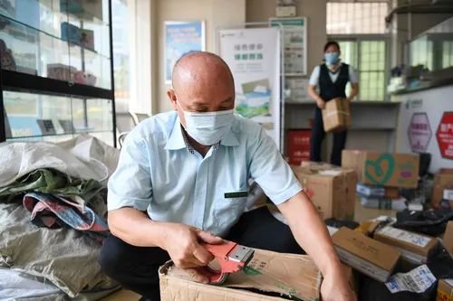 謝堅在廣東珠海市外伶仃島郵政所給破損郵件包裝箱粘上膠帶(4月21日攝)。