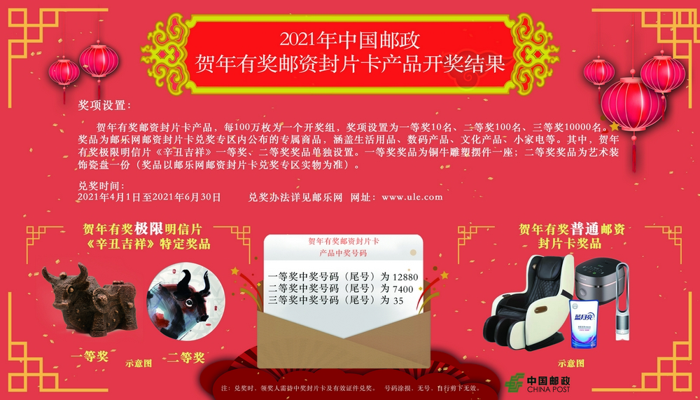 2021年賀年有獎(jiǎng)郵資封片卡中獎(jiǎng)號(hào)碼于3月26日產(chǎn)生。現(xiàn)將具體中獎(jiǎng)信息通知如下: