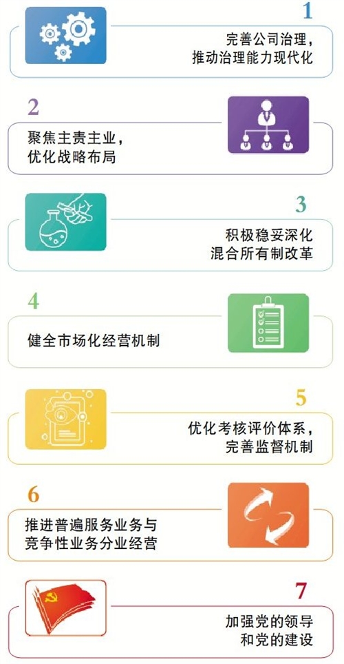 2.七個(gè)方面重點(diǎn)改革任務(wù)。《實(shí)施方案》根據(jù)中國(guó)郵政改革落地過(guò)程中遇到的重點(diǎn)難點(diǎn)問(wèn)題,提出:一是完善公司治理,推動(dòng)治理能力現(xiàn)代化,全面貫徹“兩個(gè)一以貫之”,把黨的領(lǐng)導(dǎo)融入公司治理各環(huán)節(jié),實(shí)現(xiàn)制度化、規(guī)范化、程序化,加強(qiáng)董事會(huì)建設(shè),落實(shí)董事會(huì)職權(quán),保障經(jīng)理層依法行權(quán)履職,開展對(duì)標(biāo)世界一流企業(yè)管理提升行動(dòng),加強(qiáng)各類風(fēng)險(xiǎn)管控,完成子企業(yè)公司制改制。二是聚焦主責(zé)主業(yè),優(yōu)化戰(zhàn)略布局,圍繞服務(wù)國(guó)家戰(zhàn)略,構(gòu)筑中國(guó)郵政高質(zhì)量發(fā)展的“四梁八柱”,推動(dòng)普遍服務(wù)能力提升,推動(dòng)寄遞業(yè)務(wù)核心競(jìng)爭(zhēng)力提升,推動(dòng)郵儲(chǔ)銀行高質(zhì)量發(fā)展,推動(dòng)代理金融轉(zhuǎn)型發(fā)展,推動(dòng)中郵保險(xiǎn)價(jià)值發(fā)展,推動(dòng)農(nóng)村電商生態(tài)圈建設(shè),推動(dòng)惠農(nóng)合作項(xiàng)目協(xié)同發(fā)展,推動(dòng)資產(chǎn)重組與盤活,推動(dòng)自主創(chuàng)新能力提升,清理退出不具備競(jìng)爭(zhēng)優(yōu)勢(shì)的非主營(yíng)業(yè)務(wù)和低效無(wú)效資產(chǎn),完成剝離國(guó)有企業(yè)辦社會(huì)職能,解決歷史遺留問(wèn)題。三是積極穩(wěn)妥深化混合所有制改革,把握好改革方向,務(wù)求改革實(shí)效,避免盲目性,避免一混了之。按照完善治理、強(qiáng)化激勵(lì)、突出主業(yè)、提高效率的要求,堅(jiān)持因地施策、因業(yè)施策、因企施策,宜獨(dú)則獨(dú)、宜控則控、宜參則參,分層分類深化混合所有制改革,穩(wěn)慎開展混合所有制企業(yè)骨干員工持股,推動(dòng)混合所有制企業(yè)深度轉(zhuǎn)化經(jīng)營(yíng)機(jī)制,加強(qiáng)對(duì)混合所有制改革全過(guò)程的監(jiān)督,防止國(guó)有資產(chǎn)流失。四是健全市場(chǎng)化經(jīng)營(yíng)機(jī)制,強(qiáng)化各層級(jí)郵政企業(yè)、控股子公司市場(chǎng)主體地位,切實(shí)深化勞動(dòng)、人事、分配三項(xiàng)制度改革,推行經(jīng)理層成員任期制和契約化管理,全面推進(jìn)用工市場(chǎng)化,完善市場(chǎng)化薪酬分配機(jī)制,穩(wěn)慎開展控股子公司中長(zhǎng)期激勵(lì)。五是優(yōu)化考核評(píng)價(jià)體系,完善監(jiān)督機(jī)制,完善戰(zhàn)略績(jī)效考核評(píng)價(jià)體系,健全協(xié)同高效的監(jiān)督機(jī)制。六是認(rèn)真貫徹落實(shí)《關(guān)于新時(shí)代加快完善社會(huì)主義市場(chǎng)經(jīng)濟(jì)體制的意見》要求,推進(jìn)普遍服務(wù)業(yè)務(wù)與競(jìng)爭(zhēng)性業(yè)務(wù)分業(yè)經(jīng)營(yíng)。七是加強(qiáng)黨的領(lǐng)導(dǎo)和黨的建設(shè),加強(qiáng)黨的政治建設(shè),推進(jìn)黨建工作與生產(chǎn)經(jīng)營(yíng)深度融合,加強(qiáng)領(lǐng)導(dǎo)班子建設(shè)和人才隊(duì)伍建設(shè),激勵(lì)領(lǐng)導(dǎo)人員擔(dān)當(dāng)作為,持續(xù)深入推進(jìn)全面從嚴(yán)治黨。