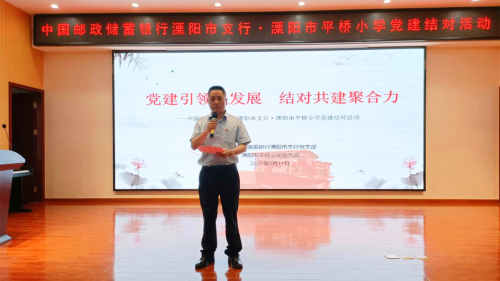 為進一步加強黨支部建設,引導和激勵廣大黨員干部“不忘初心、牢記使命”,郵儲銀行溧陽市支行黨支部、溧陽市平橋小學黨支部于5月11日上午在平橋小學報告廳開展了結對共建活動。這是該行自2016年與平橋小學簽訂結對共建協議以來,連續第6年組織黨員代表、“紅鈴鐺”課堂志愿者走進學校開展共建活動。